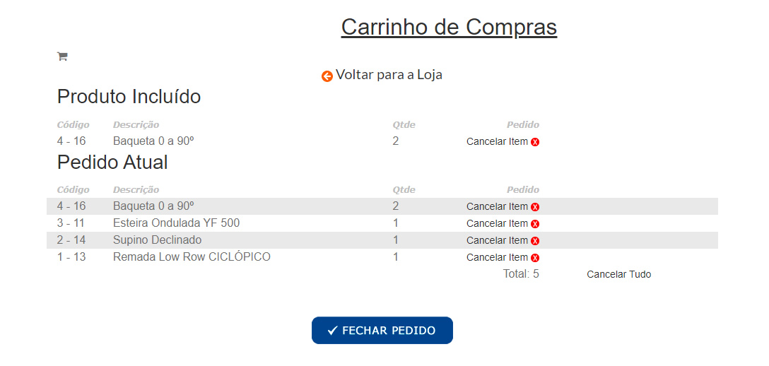 Os produtos selecionados são agrupados em uma relação com os itens (Carrinho de Compras).